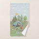 This cute blue monogrammed kids bath towel set features camping illustrations, with bears, forest trees, a campfire, and a camping pattern, and can be personalised with your boys name. The perfect blue woodland gift for your baby, toddler, or child!