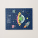 This cute and modern kids puzzle features a space alien cartoon, with a rocket ship, aliens, stars and moon, and can be personalised with your boys name. The perfect blue space themed gift for any space lover.
