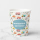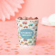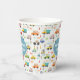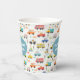This cute and whimsical birthday birthday paper cup design features a cartoon transport pattern with cars, trucks,