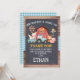 This boy's cute barnyard or farmyard birthday thank you card features a red barn, tractor, pig, horse and a cow. The design consists of a chalkboard style frame and a blue plaid and wood image background. This is a cute way to thank your little boy's guests for coming to his barnyard theme birthday party.