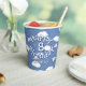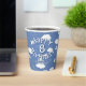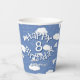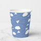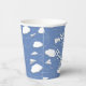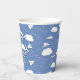 These easy-to-personlize paper aeroplanes themed paper cups for a boy's or girl's birthday party feature various illustrated folded white paper aeroplanes with whimsical curvy dashed-line flight trails amongst puffy white clouds on a customisable blue background - by katz_d_zynes