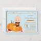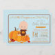 Little pumpkin baby shower invitation with adorable baby boy in a cart of pumpkins on a cute baby blue and brown background. You can easily customise this cute little pumpkin baby shower invitation for your event by simply adding your details.