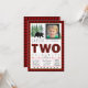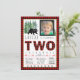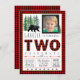 Boys Lumberjack second birthday party invitation with bear and trees on a rustic lumberjack buffalo plaid background. This cute red and black buffalo plaid lumberjack second birthday party invitation is easily customised for your event by simply adding your photo and event details.