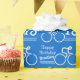 Birthday wrapping paper in blue and white. Personalise this boys birthday paper with your choice of name and age. Currently reads Happy Birthday Bradley 10. Ideal for cycle gifts and cycling sports fans. Uniquely designed by Sarah Trett.