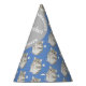 This boys party hat features a Cute Grey and white hamster pattern design, with a fluffy hamster on a blue background. The name can be changed.