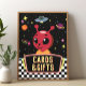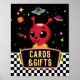 This Out of This World cards & gifts sign features a cute red alien with planets, stars, and a UFO in a fun retro neon space style. Perfect for an alien, outer space, or galaxy kids party.