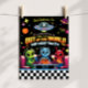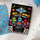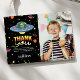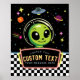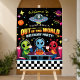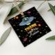 This Out of This World custom sign features a cute green alien with planets, stars, and a UFO in a fun retro neon space style. Personalize with your own text for your space themed birthday party.