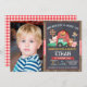 This boy's cute barnyard or farmyard birthday party invitation features a red barn, green tractor, pig, horse and a cow. The design consists of a chalkboard style frame and a red plaid and wood image background. This is a cute invitation and way to invite your child's friends to his barnyard theme birthday party.