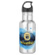 Prepare your child for school or preschool with these stylish and adorable watercolor police prints on a kid-sized water bottle. It showcases various shades of blue, a background adorned with stars, and a blue police officer hat. The centre of the hat features a badge that can be personalised with your child's favourite City Police Department or their name and lucky number. This kid-sized water bottle suits school, playgrounds, camps, sleepovers, visits to relatives, and travel. It also makes a great birthday gift.