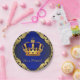 Prince baby shower paper plates with fancy royal blue and gold crown and blue it's a prince banner on a rich blue and gold swirl background. You can customise with the text of your choice in the font style you prefer. You can move the crown as needed.