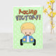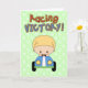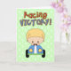 Cute little boy's birthday card done in a pale green polka dot background, with colourful graphic text reading Racing Victory! and a little boy in a race car. More cute race car graphics inside the card along with custom blue text reading to personalise for a sweet card any young boy will love.