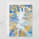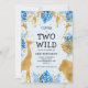 This "two wild" jungle safari themed boy's second birthday party invitation features gold faux foil animals (giraffe, lion and monkeys), gold and blue jungle foliage, and a sprinkling of gold confetti on a pale blue background. Add the name of the birthday boy and party details in black text. A coordinating frame pattern of blue and gold leaves appears on the reverse.