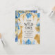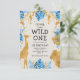 This "wild one" jungle safari themed boy's first birthday party invitation features gold faux foil animals (giraffe, lion and monkeys), gold and blue jungle foliage, and a sprinkling of gold confetti on an ecru background. Add the name of the birthday boy and party details in black text. A coordinating frame pattern of blue and gold leaves appears on the reverse.