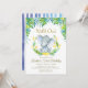 Boys safari themed 1st birthday invitations, featuring the cutest baby elephant with polka dot ears. The word "wild one" in a glittery gold just above the baby elephant, green and blue tropical foliage and an ombre watercolor stripe on the back. Easily personalise this cute modern invitation template with your event details.