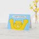 A giant smiling ginger cat with his paws in the air, saying 'Congratulations', against a sky blue background.
