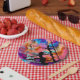 A brightly-coloured (orange, blue, pink,yellow, black), highly abstract fractal image.