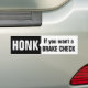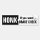 Hilarious HONK if you want a BRAKE CHECK joke bumper sticker is a fun way to give other motorists fair and funny warning that it will backfire on them if they lay on the horn to try to get you to speed up.