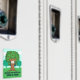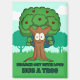 Branch Out With Love and Hug A Tree magnet, featuring a nature inspired scene of a funny happy tree with big goofy eyes and a wide friendly grin. The tree trunk is brown and the leaves are green dotted with red heart shaped apples. Below are two text templates in a chunky fun green font with a black stroke. One reading "Branch Out With Love" and the other reading " Hug A Tree" These can be used as they are or you can use the text templates to add your own text. The background is a simple nature scene with trees, grass and clouds. Ideal for tree lovers, nature lovers and a love for the environment.