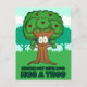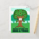 Branch Out With Love and Hug A Tree postcard, featuring a nature inspired scene of a funny happy tree with big goofy eyes and a wide friendly grin. The tree trunk is brown and the leaves are green dotted with red heart shaped apples. Below are two text templates in a chunky fun green font with a black stroke. One reading "Branch Out With Love" and the other reading " Hug A Tree" These can be used as they are or you can use the text templates to add your own text. The background is a simple nature scene with trees, grass and clouds. Ideal for tree lovers, nature lovers and a love for the environment.