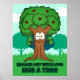 Branch Out With Love and Hug A Tree poster, featuring a nature inspired scene of a funny happy tree with big goofy eyes and a wide friendly grin. The tree trunk is brown and the leaves are green dotted with red heart shaped apples. Below are two text templates in a chunky fun green font with a black stroke. One reading "Branch Out With Love" and the other reading " Hug A Tree" These can be used as they are or you can use the text templates to add your own text. The background is a simple nature scene with trees, grass and clouds. Ideal for tree lovers, nature lovers and a love for the environment.