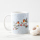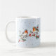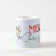 Branch with robin birds and berries Christmas holiday mug. This charming Christmas design showcases a fir branch with berries and redbreast robins on it. The background is of pale blue color. The phrase "Merry Christmas" combines script and decorative fonts. Personalize it with your own name.