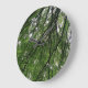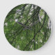 This awesome clock features a photograph taken from within a dense forest. The photograph shows the view of the sky through a tangled and beautiful web of tree branches and luscious green leaves.