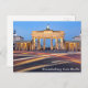 A nighttime photograph of the Brandenburg Gate in Berlin with traffic trails is featured on this postcard.