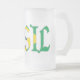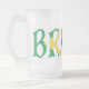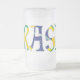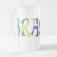 Frosted glass beer mug or Stein features the word BRASIL, which Is the word Brazil in Portuguese, in the colours of the Brazilian flag or Brasileiro Bandeira. Great gift. Might be fun at a Brazilian family reunion or travel group.