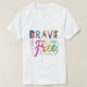The t-shirt features the text "Brave" written in a bold, geometric pattern with a variety of colours. It contrasts with "Free" which is written in a flowing, hand-drawn script that uses a rainbow of colours.
