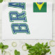 This item has the letters BRAZIL in a collegiate style in an arc over the Brazilian flag. The design uses the Brazilian colours of green, yellow and blue. The flag has a blue disc at the centre depicting a starry sky spanned by a curved band inscribed with the national motto, within a yellow rhombus, on a green field.
