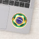* A gold ring surrounds this soccer ball with Brazilian flag over the ball.