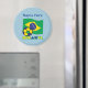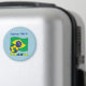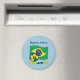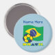Round magnet shows the word BRAZIL, in the colours of the Brazilian flag, featured under the flag of Brazil. Above is a soccer ball, also in flag colours. The flag itself flies above and behind it all. Add a name, in blue letters, above the design for a personalised touch. Background is light blue.Fun way to show support for TEAM BRAZIL during international and world soccer meets. Great stocking stuffer. Might even be fun memento for family reunions.
