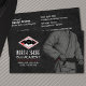 A dynamic Brazilian Jiu-Jitsu design featuring a gi-clad figure holding a black belt with red rank stripe, paired with a modern emblem and bold academy title. The layout balances strong illustration with clean typography, creating a professional and impactful look. Logo graphics are vector-based, allowing full colour customisation for a personalised finish. Ideal for BJJ academies, clubs, instructors, and self-defence programs.