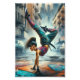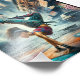 The design shows a lively scene in which a break dancer women performs in full swing on the street. The main character, the break dancer, is in the middle of a powerful handstand.