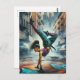 The design shows a lively scene in which a break dancer women performs in full swing on the street. The main character, the break dancer, is in the middle of a powerful handstand.