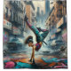 The design shows a lively scene in which a break dancer women performs in full swing on the street. The main character, the break dancer, is in the middle of a powerful handstand.