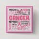 October is Breast Cancer Awareness Month, but it's something that we should promote year round. This pin is designed to encourge all women to promote breast cancer awareness. It features a large square filled with words about breast cancer awareness, including love, faith, strength, believe, support, joy, warrior, brave, awareness and cure. The typography is done in pink or black and in a variety of type fonts and there are two stripes around the outer edge.