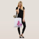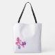 This tote bag is shown in a breast cancer awareness pink ribbon and butterflies art print.