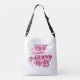 This cross-body tote bag is shown in a breast cancer awareness pink ribbon art print.