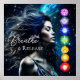 Peaceful ai art depicting a beautiful woman with hair blowing in the wind and a pretty blue celestial blue ethereal background. Quote, "Breathe and Release." Pretty illuminated chakras spiritual art.