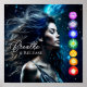 Peaceful ai art depicting a beautiful woman with hair blowing in the wind and a pretty blue celestial blue ethereal background. Quote, "Breathe and Release." Pretty illuminated chakras spiritual art.