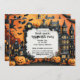 This Halloween party invitation features a playful brick-themed design, perfect for kids who love building with blocks. The scene depicts a lively town ready for Halloween, with every house constructed entirely from colourful bricks. Each brick-built house is adorned with festive Halloween decorations, including jack-o'-lanterns, giving the town a fun and spooky vibe. Bats made from bricks are flying above, adding to the Halloween excitement.