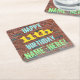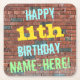 This fun birthday-themed coaster design features a message like "HAPPY 11th BIRTHDAY, NAME-HERE!", where the name can be personalised. The background features a representation of a brick wall consisting of some reddish-brown coloured bricks. The customisable message text features colours like blue, yellow, and green, and it has an appearance inspired by that of painted graffiti. Coasters like these might be useful as practical decorations at a birthday party for somebody who is celebrating their eleventh birthday. [~Z0000288]