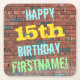This fun birthday-themed coaster design features a message like "HAPPY 15th BIRTHDAY, FIRSTNAME!", where the name can be personalised. The background features a representation of a brick wall consisting of some reddish-brown coloured bricks. The customisable message text features colours like blue, yellow, and green, and it has an appearance inspired by that of painted graffiti. Coasters like these might be useful as practical decorations at a birthday party for somebody who is celebrating their fifteenth birthday. [~Z0000288]