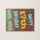 This fun birthday-themed puzzle design features a message like "HAPPY 17th BIRTHDAY, NAME-HERE!", where the name can be personalised. The background features a representation of a brick wall consisting of some reddish-brown coloured bricks. The customisable message text features colours like blue, yellow, and green, and it has an appearance inspired by that of painted graffiti. A puzzle like this might be used as a fun way to send birthday wishes to somebody who is celebrating their seventeenth birthday, and who perhaps really likes doing puzzles. [~Z0000285]
