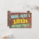 This fun birthday party invitation design features a message like "NAME-HERE’S 18th BIRTHDAY PARTY!", where the name can be personalised, on the front. The background features a representation of a brick wall consisting of some reddish-brown coloured bricks. The customisable message text on the front features colours like blue, yellow, and green, and it has an appearance inspired by that of painted graffiti. The back features a customisable message that could include relevant details about the birthday party. Birthday party invitations like this might be a fun way to invite family and friends to a birthday party being held for somebody who is celebrating their eighteenth birthday. [~Z0000287]