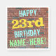 This fun birthday-themed paper napkin design features a message like "HAPPY 23rd BIRTHDAY, NAME-HERE!", where the name can be personalised. The background features a representation of a brick wall consisting of some reddish-brown coloured bricks. The customisable message text features colours like blue, yellow, and green, and it has an appearance inspired by that of painted graffiti. Napkins like these could perhaps be used at a birthday party for somebody who is celebrating their twenty third birthday. [~Z0000271]