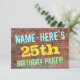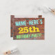 This fun birthday party invitation design features a message like "NAME-HERE’S 25th BIRTHDAY PARTY!", where the name can be personalised, on the front. The background features a representation of a brick wall consisting of some reddish-brown coloured bricks. The customisable message text on the front features colours like blue, yellow, and green, and it has an appearance inspired by that of painted graffiti. The back features a customisable message that could include relevant details about the birthday party. Birthday party invitations like this might be a fun way to invite family and friends to a birthday party being held for somebody who is celebrating their twenty fifth birthday. [~Z0000287]