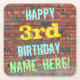 This fun birthday-themed coaster design features a message like "HAPPY 3rd BIRTHDAY, NAME-HERE!", where the name can be personalised. The background features a representation of a brick wall consisting of some reddish-brown coloured bricks. The customisable message text features colours like blue, yellow, and green, and it has an appearance inspired by that of painted graffiti. Coasters like these might be useful as practical decorations at a birthday party for somebody who is celebrating their third birthday. [~Z0000288]