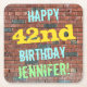 This fun birthday-themed coaster design features a message like "HAPPY 42nd BIRTHDAY, JENNIFER!", where the name can be personalised. The background features a representation of a brick wall consisting of some reddish-brown coloured bricks. The customisable message text features colours like blue, yellow, and green, and it has an appearance inspired by that of painted graffiti. Coasters like these might be useful as practical decorations at a birthday party for somebody who is celebrating their forty second birthday. [~Z0000288]